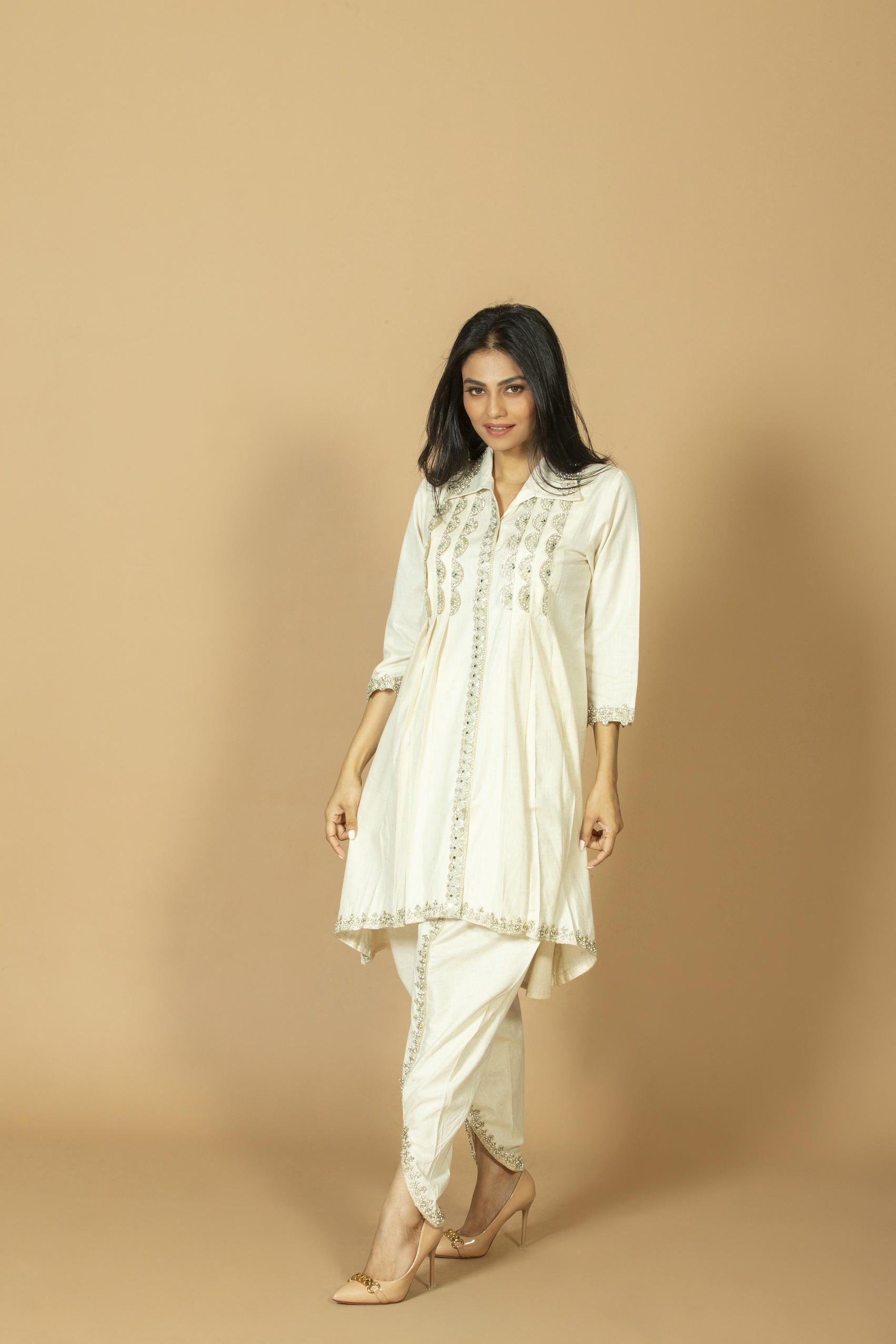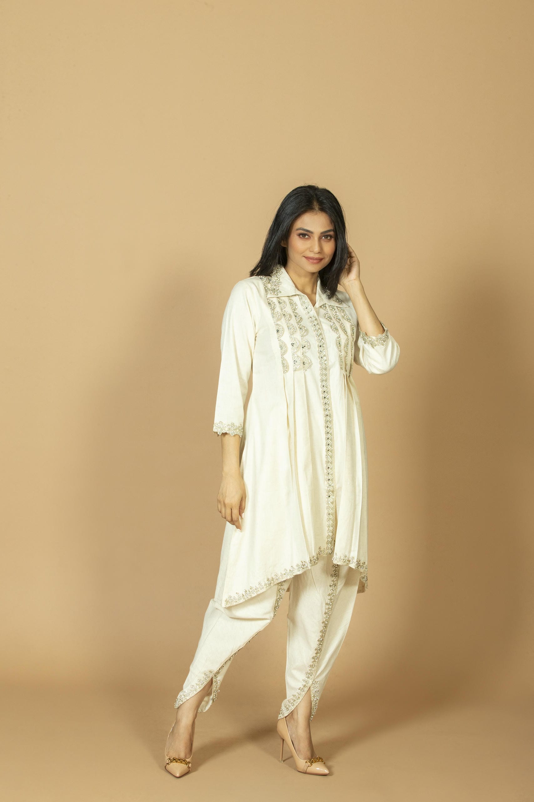 Women Ivory Embroidered Straight Kurti with Dhoti Pant | Ethnic Fusion Wear Set